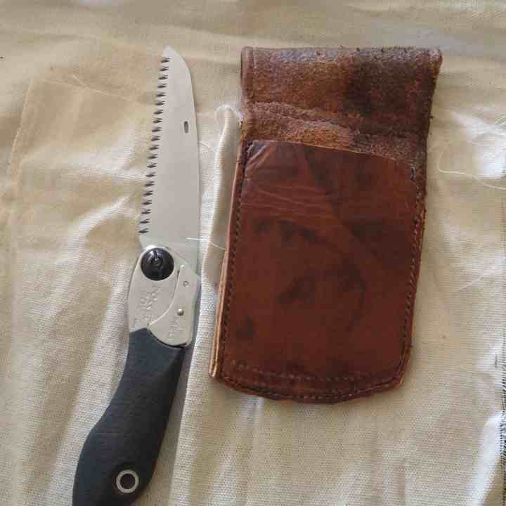 Des défauts ont été délibérément laissés de ma part. Car j’ai réutilisé du cuir d’un ancien projet, ne vous étonnez pas de voir des marques de couture, ou le fait que l’étui mini scie pliante ne soit pas parfaitement symétrique, c’est assumé.